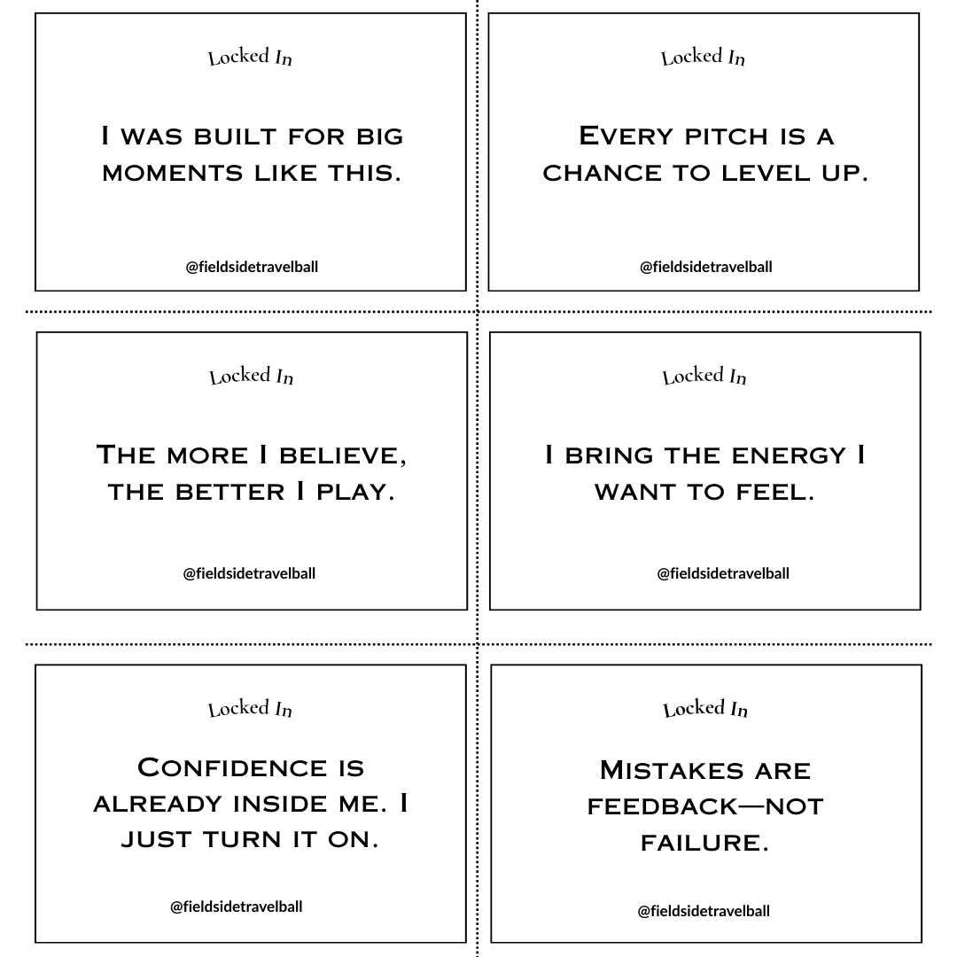 Confidence cues, calming resets, and high-impact prompts your player can use anytime—before games, between innings, or when things get tough.