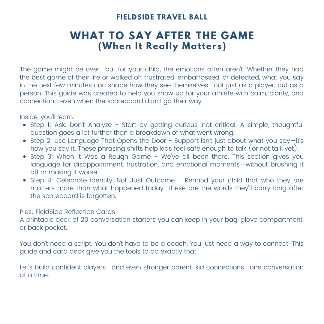 What to Say After the Game is a digital resource that gives you a simple, powerful 4-step framework to support your athlete when it counts the most—without overanalyzing, overreacting, or shutting them down.
